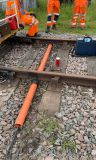 Then, at the new end of the circuit, much closer to the junction, a new feed unit (to do much the same as the old one) was installed in the modern steel location case. We dug-in some protective orange pipe, and wired the new feed to the rails. Since every track circuit is different, we spent a bit of time 'tuning' its sensitivity. Too high and wet leaves show 'occupied'. Too low, and some trains might not be detected at all.