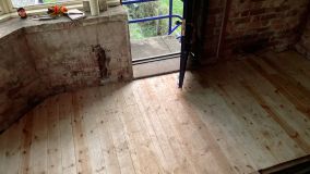 This week, we cut all the boards for Phase 2 of the floor rebuild at Hotchley Hill, and nearly finished screwing them down. This was easier than the central section in that we can tolerate a slightly ragged edge against the wall - and harder in that the bricks aren't in a straight line themselves.