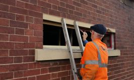 Today, we wanted to push ahead with painting the windowframes at HH. A surprisingly large area to cover. Eyeing the weather forecast suspiciously, we decided to give it a go, working on the areas on the south side of the building, protected by the canopy from the chance of showers in the northerly wind.