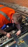 In the station at Ruddington, that means the clamp-lock point machine on platform two. This has now gained two hydraulic rams in the four-foot, carefully packed to the correct alignment.
