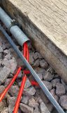 Those with a good memory might recall that we had trouble in the past with the hydraulic lines on a similar machine being burnt by falling cinders from a passing steam loco. We learn; the hoses on this machine have been routed through a galvanised steel conduit, clamped to the sleeper.