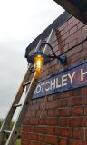 Despite the inclement weather, the luminaire mentioned in previous posts was installed above Hotchley Hill’s sign this weekend and with the sky dark and the generator on hand, it seemed a great opportunity to give it a test! While there currently isn’t mains electricity installed this is a sign of things to come as potential methods of connecting a supply to the box are being discussed.