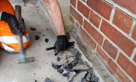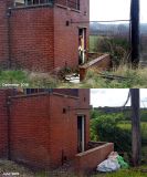 Meanwhile, the handrails were given a second coat of paint, and we broke away some of the bitumen covering on the roof area at the north-east corner of the building. This was intended to shed water into a drain, but has slowly warped so as to trap wet dirt against the wall, and encourage the growth of weeds.