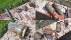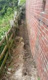 As illustrated, we discovered a long concrete gutter set against the wall. This has clearly allowed plants to thrive, and we had to saw through several large roots to expose as much as we did. We also unearthed some fragments of the original cast iron drainpipes (painted blue), a broken teapot, half a jar of jam and a few other items. The trough seems to extend a long way southwards, so we're far from done digging yet...