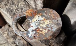 * A padlock, with some still-legible printed paper stuck to it. Anyone recognise where it might have come from?