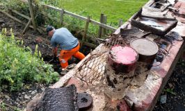 A quiet day, with only two of us shovelling away in torrential rain and dazzling sunlight, sometimes within a few minutes of each other! Slowly, but surely, the foot of the embankment is returning to its original depth. As the soil level drops, we're also pulling the fence back upright, so far as possible - although it will need substantial repairs.