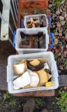 Downstairs, the acquisition of some new polypropylene storage boxes is beginning to make a difference to the heaving shelves of interesting finds. Mostly-interesting, anyway. The least valuable items (unrecognisable lumps, general litter) were moved round to the battery room for disposal, while the better ones, from which the history of the building can be deduced, were cleaned up, sorted and stowed in the new "boxen".