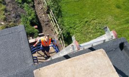 As well as replacing the felt and underlying membranes, the contractors have cast a new hopper for the integral concrete gutter at the back of the main roof, re-skirted the open viewing area on the north side of the box, and installed new downpipes on the back wall of the building, draining into our soon-to-be-completed ditch.