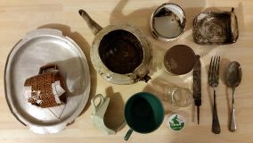 After that, we spent some time working on the possibility of displaying some of our finds in the cabin at Rushcliffe Halt. We have been generously given a small glass-fronted display case, but that leaves the question of what to put in it. Three-dozen milk bottles wouldn't, in themselves, make a very interesting museum exhibit! We selected a few of the (hopefully) more interesting and representative items, and took them away for cleaning somewhere with plumbed water. (Pictured, but it isn't all tableware!)