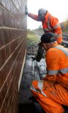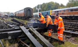The first two-and-two-halves lengths of timber were cut from the stacked-up remains of an old crossover at Rushcliffe Halt, but the pit needs four eight-foot lengths, and there were no more available in the area. We found some stored at Ruddington, but they were too long to fit in the vehicles available. Thankfully, Cutting 'Edge's resident chainsaw specialist offered to make a special trip to Ruddington for the job, and with the piece duly cut to length, it just about fit in the back of our van.