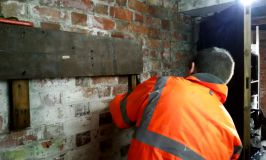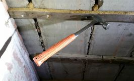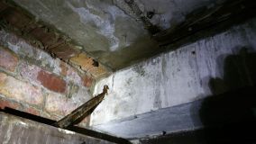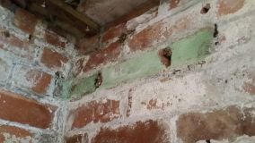 Looking upwards, we finished-off removing the old ceiling by pulling out all the nails that held up fibreboard panels. The panels had been completely sodden, but the batons that they were attached to seem remarkably good, except for one corner, where rainwater has been directed into the room. There, the wood has the same consistency as a kitchen sponge!