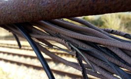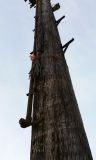 Outside, a hacksaw made reasonably short work of the rusted conduit, and some wire snips tidied up the phone wires that were raggedly flapping around the pole. Inside, the conduit was still in excellent condition, and could be simply unscrewed from the wall. Referring to the photo, note how the original installers ran it down to the board at a skewed angle!