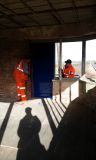 In the same movement, we took down the door opposite, on the south side of the operating floor. This has not seen the abuse the north one had, and is still very close to being flat. After a little trouble getting the bottom hinge-pin loose (It being too close to the floor for a hammer and punch to be applicable), the south door came out, and we retraced our steps to the van. This door was a little lighter, without its top-panel, and easier to hold for the same reason.