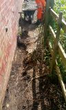 As illustrated, we discovered a long concrete gutter set against the wall. This has clearly allowed plants to thrive, and we had to saw through several large roots to expose as much as we did. We also unearthed some fragments of the original cast iron drainpipes (painted blue), a broken teapot, half a jar of jam and a few other items. The trough seems to extend a long way southwards, so we're far from done digging yet...