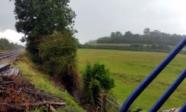 A quiet day, with only two of us shovelling away in torrential rain and dazzling sunlight, sometimes within a few minutes of each other! Slowly, but surely, the foot of the embankment is returning to its original depth. As the soil level drops, we're also pulling the fence back upright, so far as possible - although it will need substantial repairs.